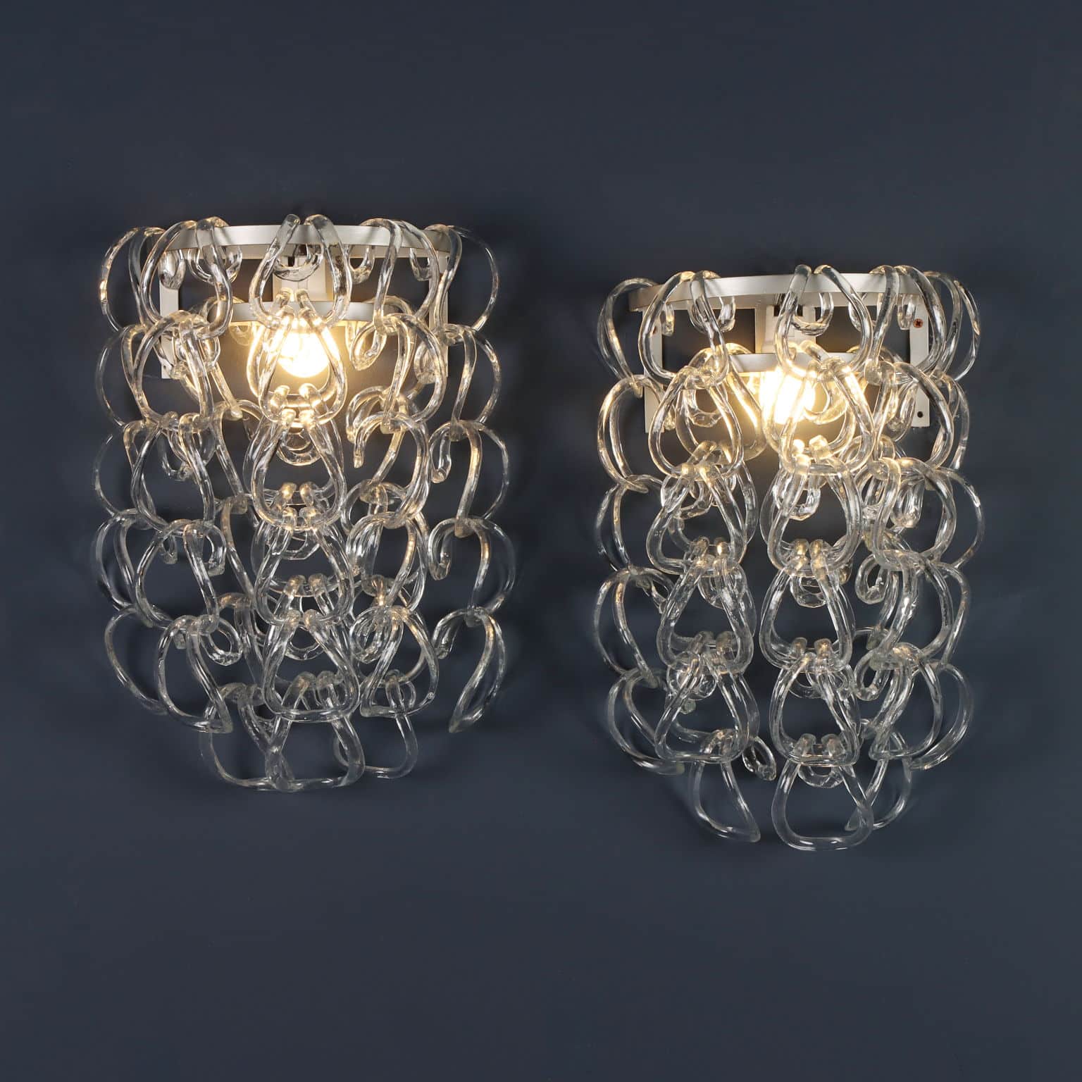 Pair of wall lamps ‘Giogali’ series with transparent Murano glass pendants woven around a chromed metal frame.