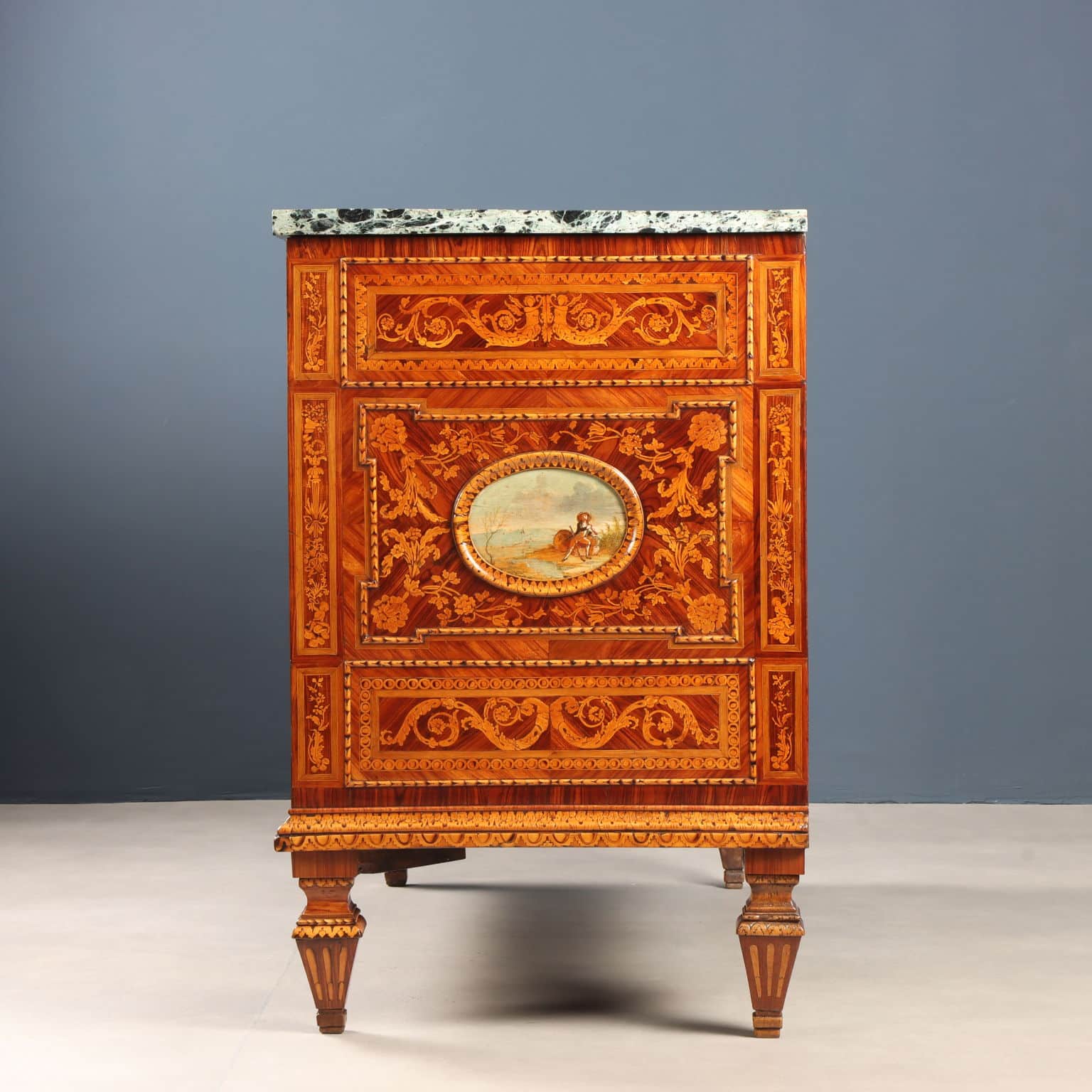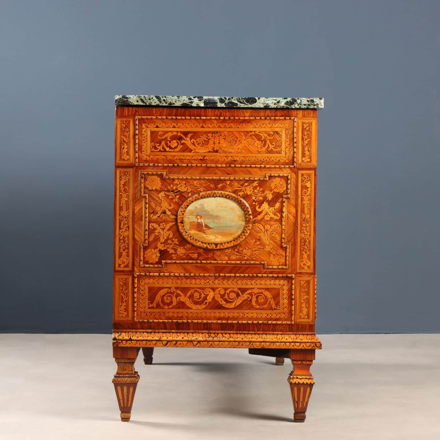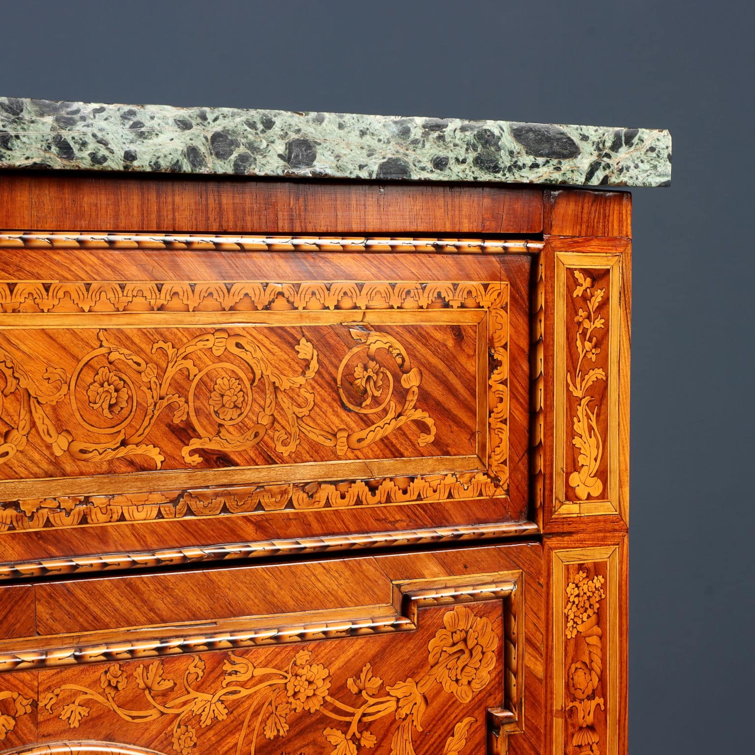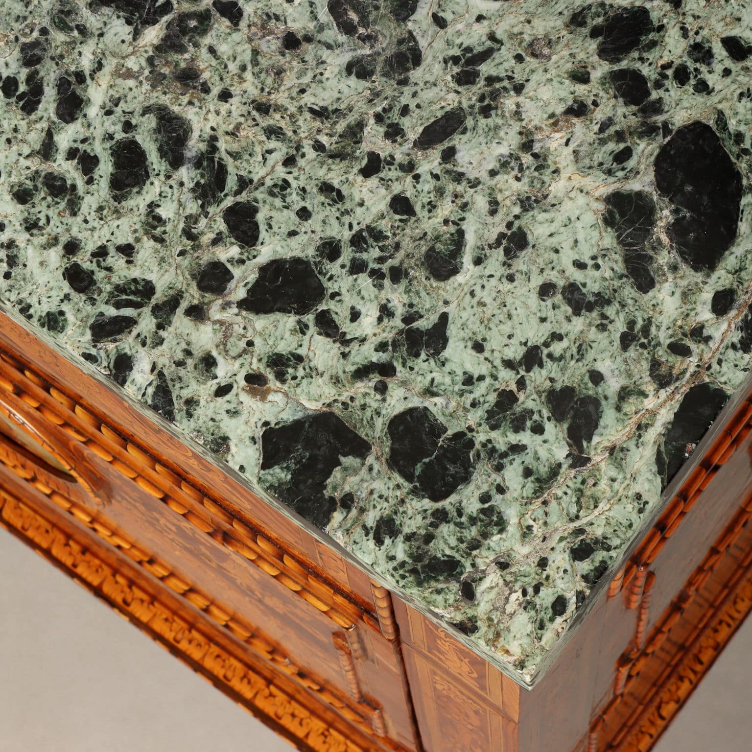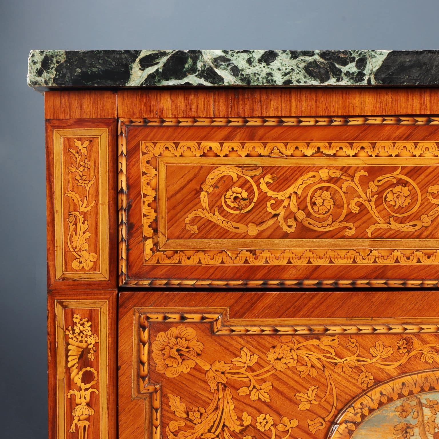 The central section presents shaped reserves with an oval medallion in the middle, which divides the drawer front into two panels; the background of the reserves is always inlaid with floral motifs, while the four roundels are inlaid with bucolic scenes using various woods — the sky and the figures’ flesh tones are painted. All the panels are framed by small raised mouldings, inlaid with a running arrow motif or, for the oval frames enclosing the roundels, with successive leaves. On the bois de violette ground, the inlay is executed in boxwood, with sand-shading used to create depth; only in the roundels is walnut burl used for the ground, with other woods forming the figures. The top is in antique green marble.
