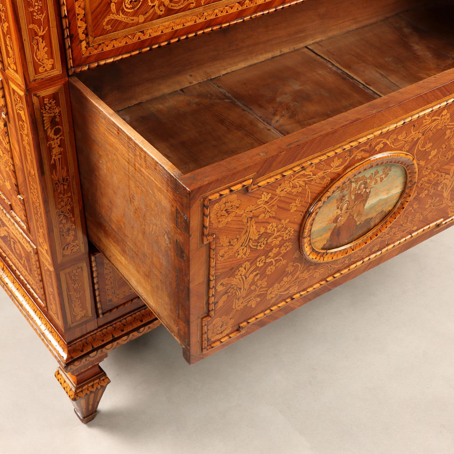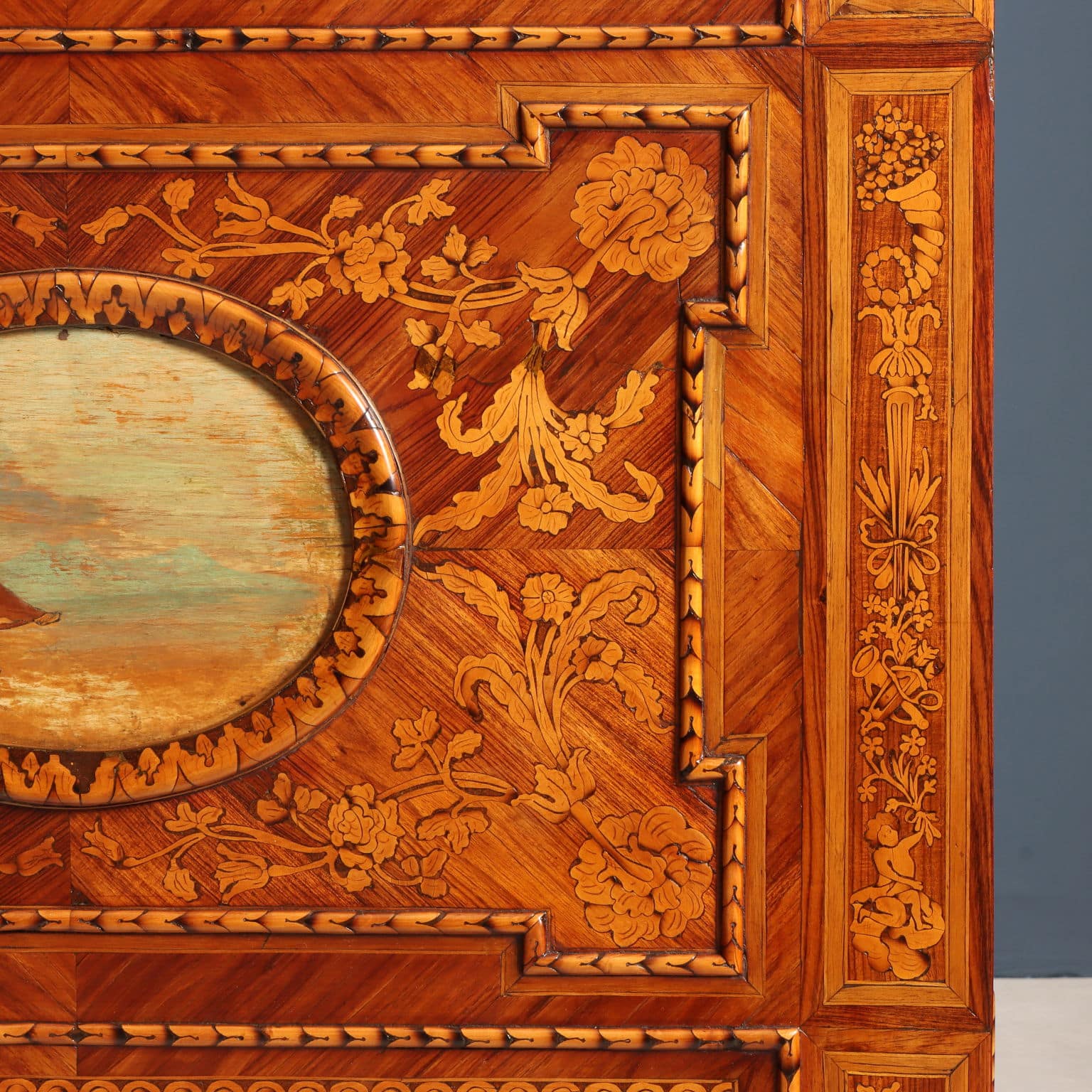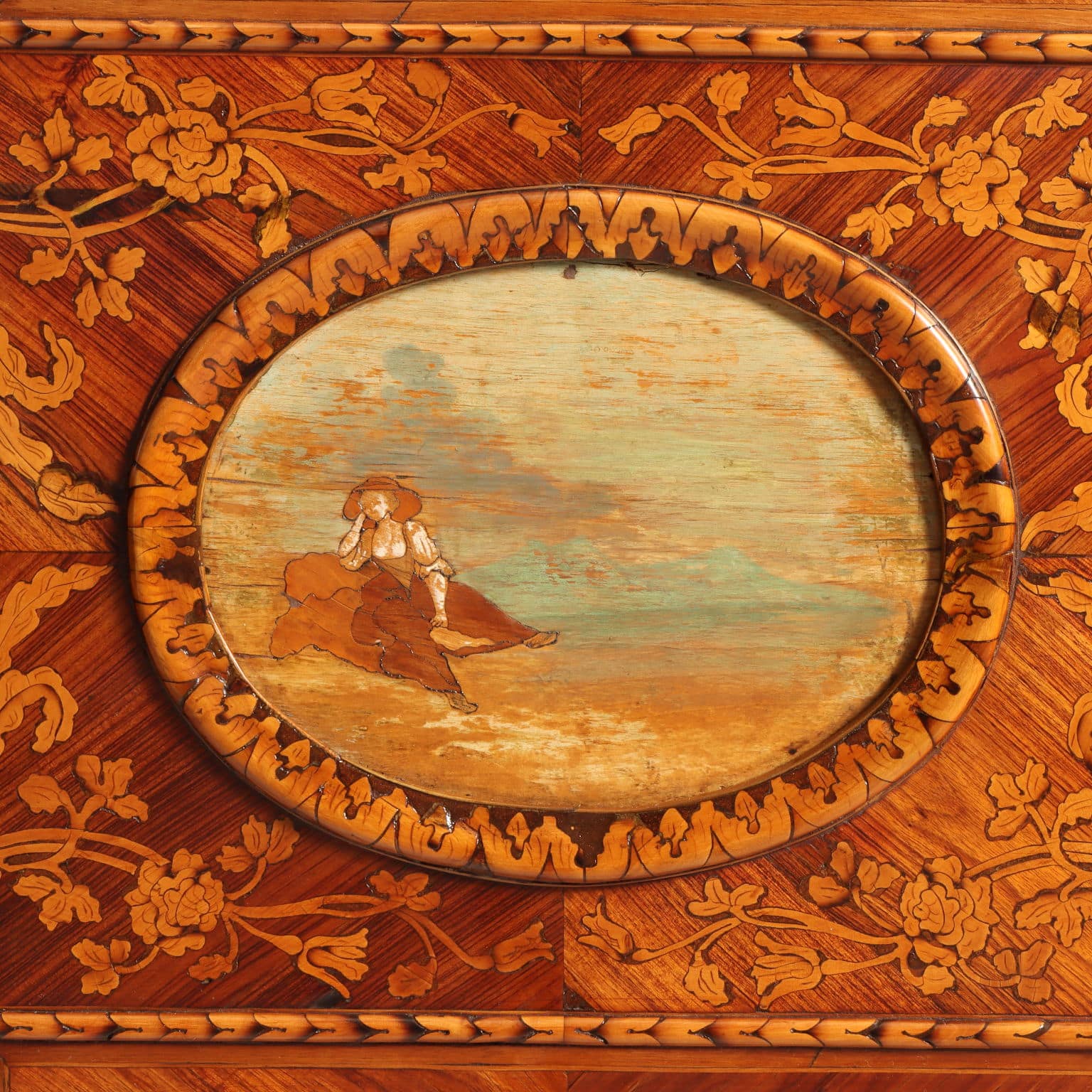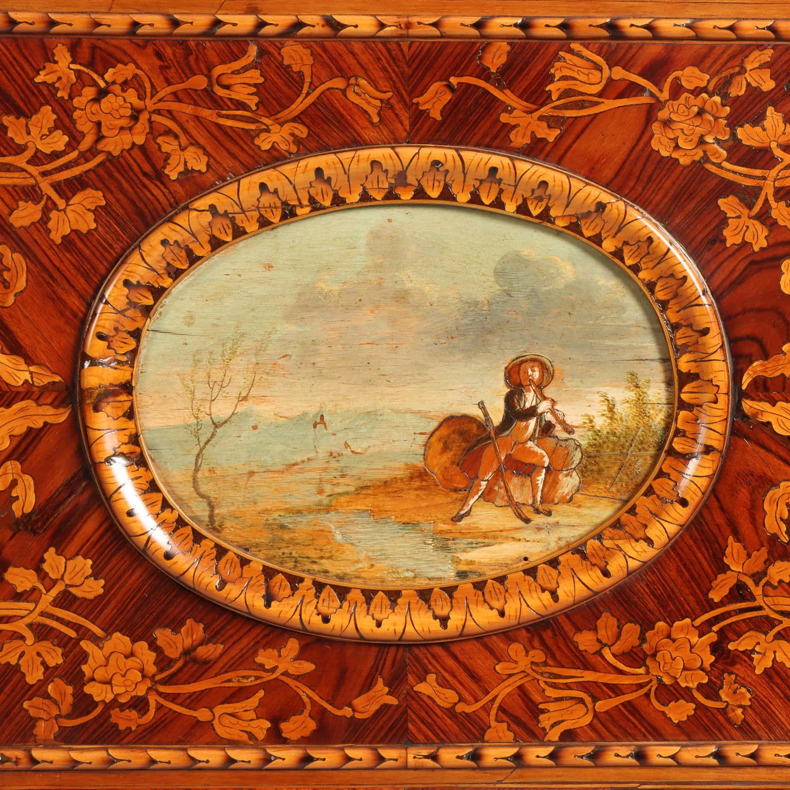 The central section presents shaped reserves with an oval medallion in the middle, which divides the drawer front into two panels; the background of the reserves is always inlaid with floral motifs, while the four roundels are inlaid with bucolic scenes using various woods — the sky and the figures’ flesh tones are painted. All the panels are framed by small raised mouldings, inlaid with a running arrow motif or, for the oval frames enclosing the roundels, with successive leaves. On the bois de violette ground, the inlay is executed in boxwood, with sand-shading used to create depth; only in the roundels is walnut burl used for the ground, with other woods forming the figures. The top is in antique green marble.