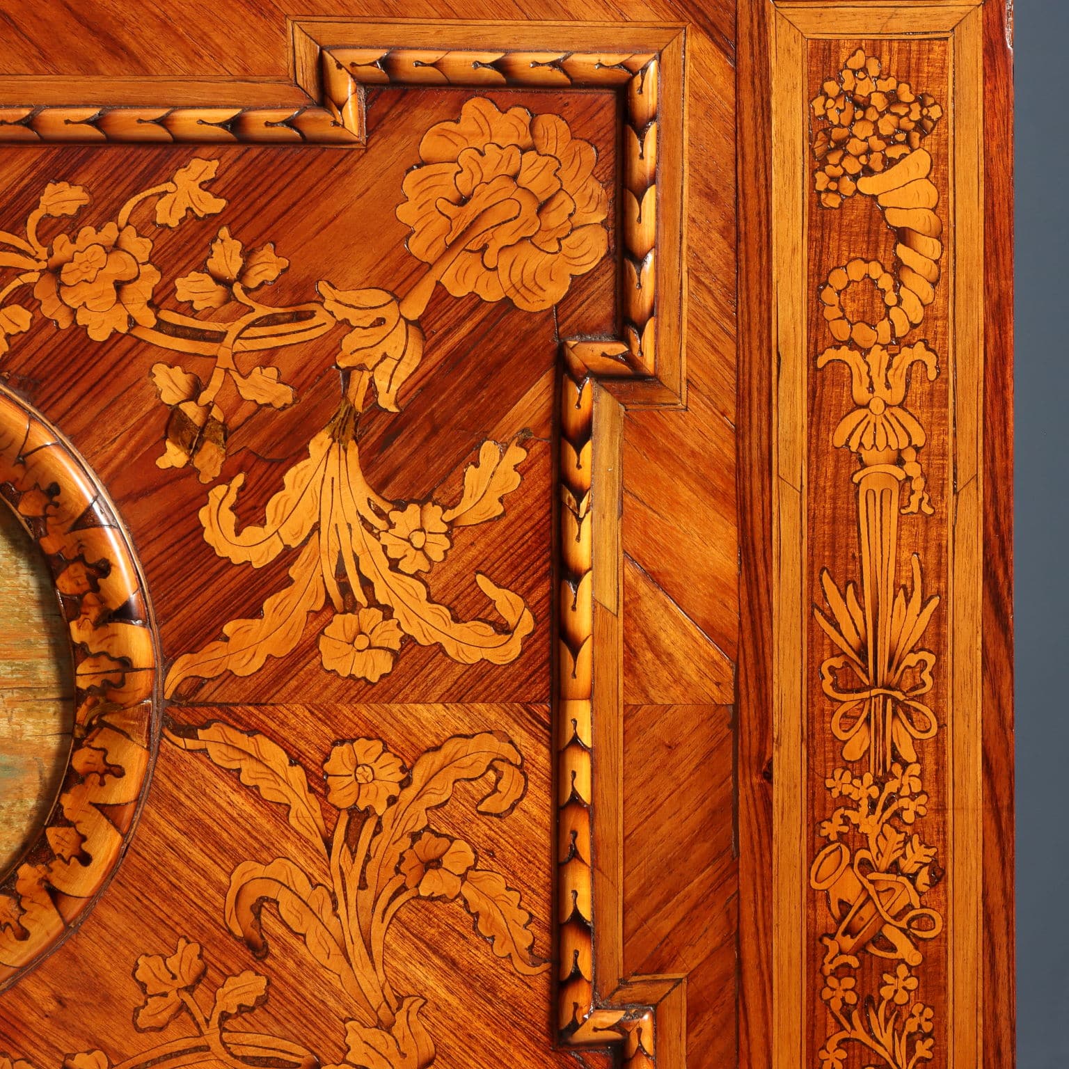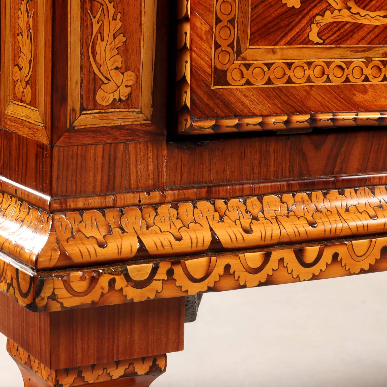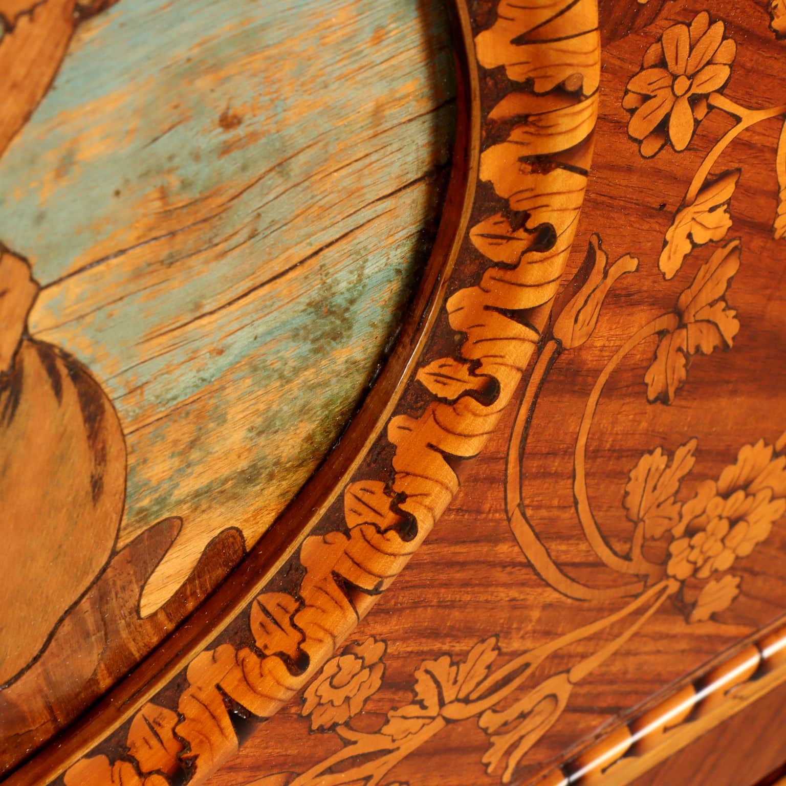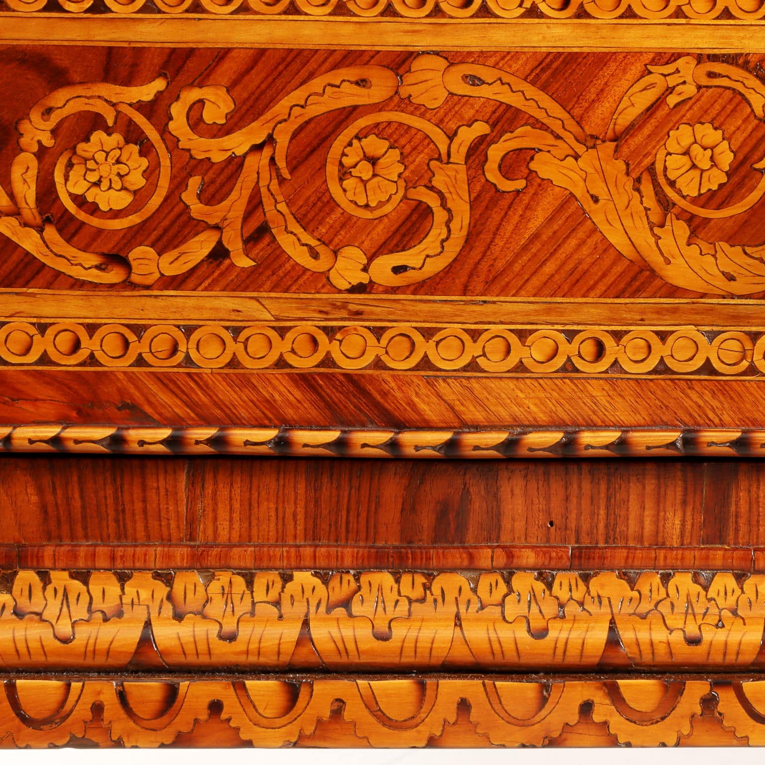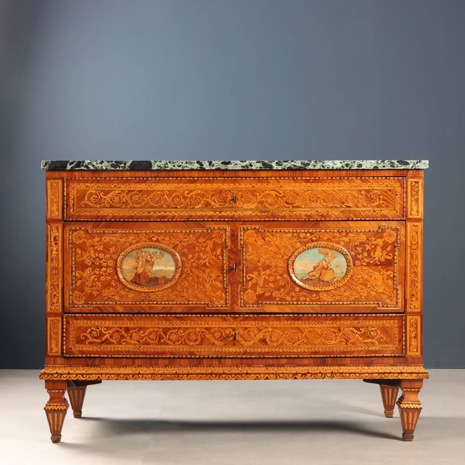 The central section presents shaped reserves with an oval medallion in the middle, which divides the drawer front into two panels; the background of the reserves is always inlaid with floral motifs, while the four roundels are inlaid with bucolic scenes using various woods — the sky and the figures’ flesh tones are painted. All the panels are framed by small raised mouldings, inlaid with a running arrow motif or, for the oval frames enclosing the roundels, with successive leaves. On the bois de violette ground, the inlay is executed in boxwood, with sand-shading used to create depth; only in the roundels is walnut burl used for the ground, with other woods forming the figures. The top is in antique green marble.