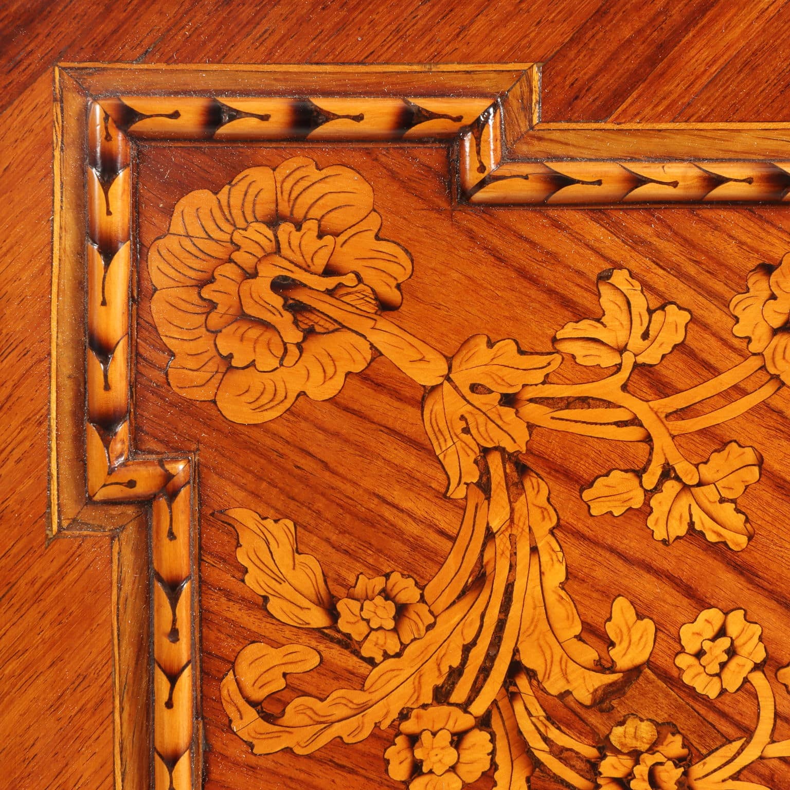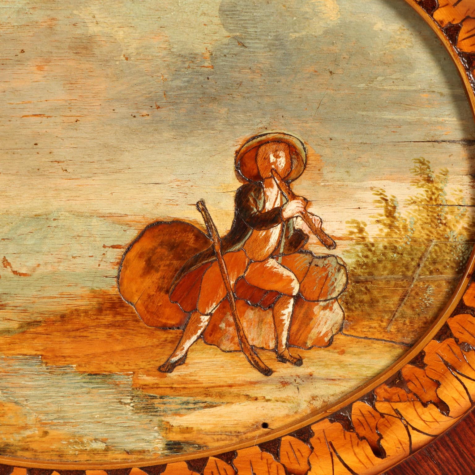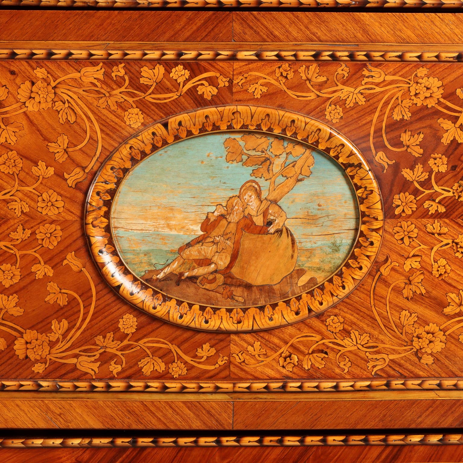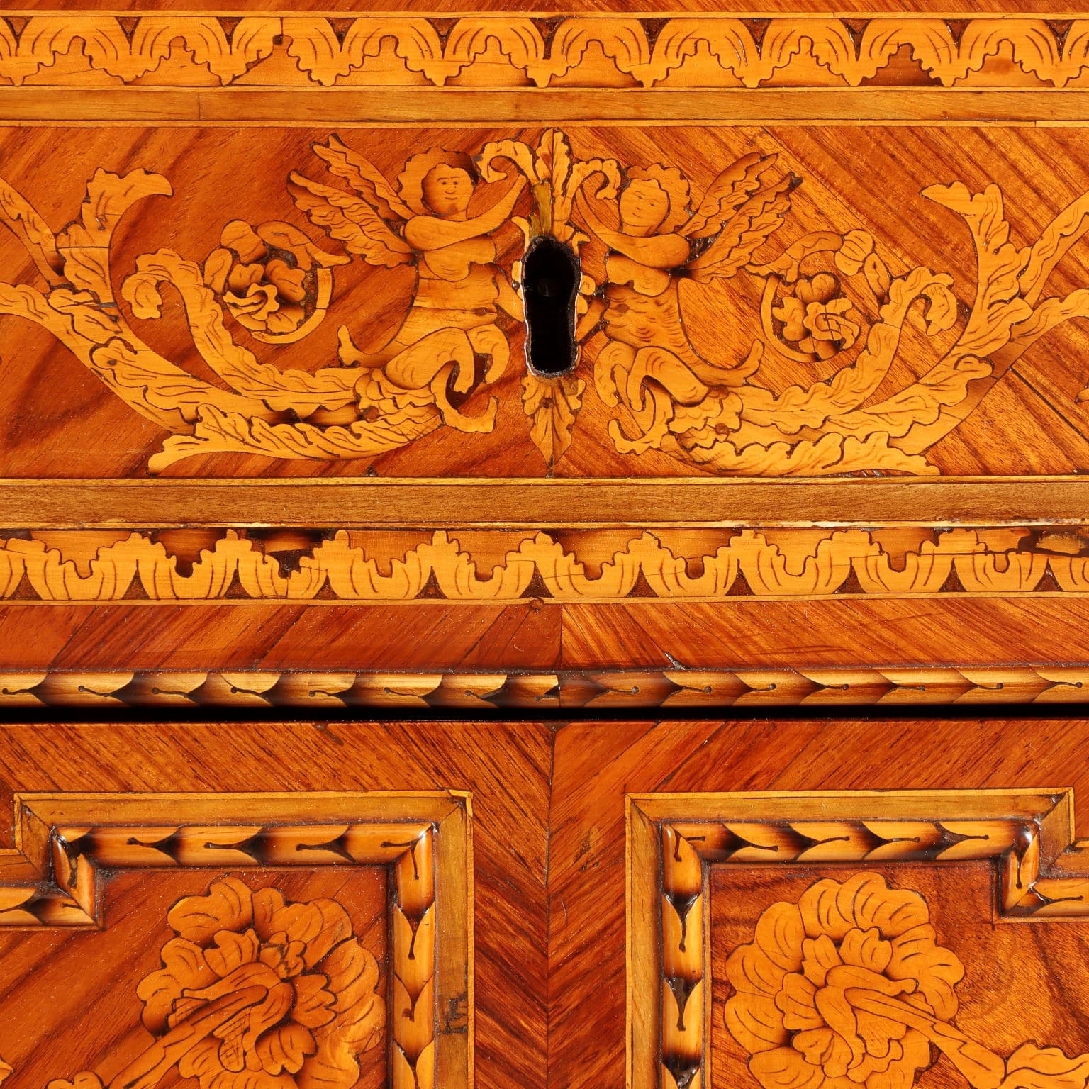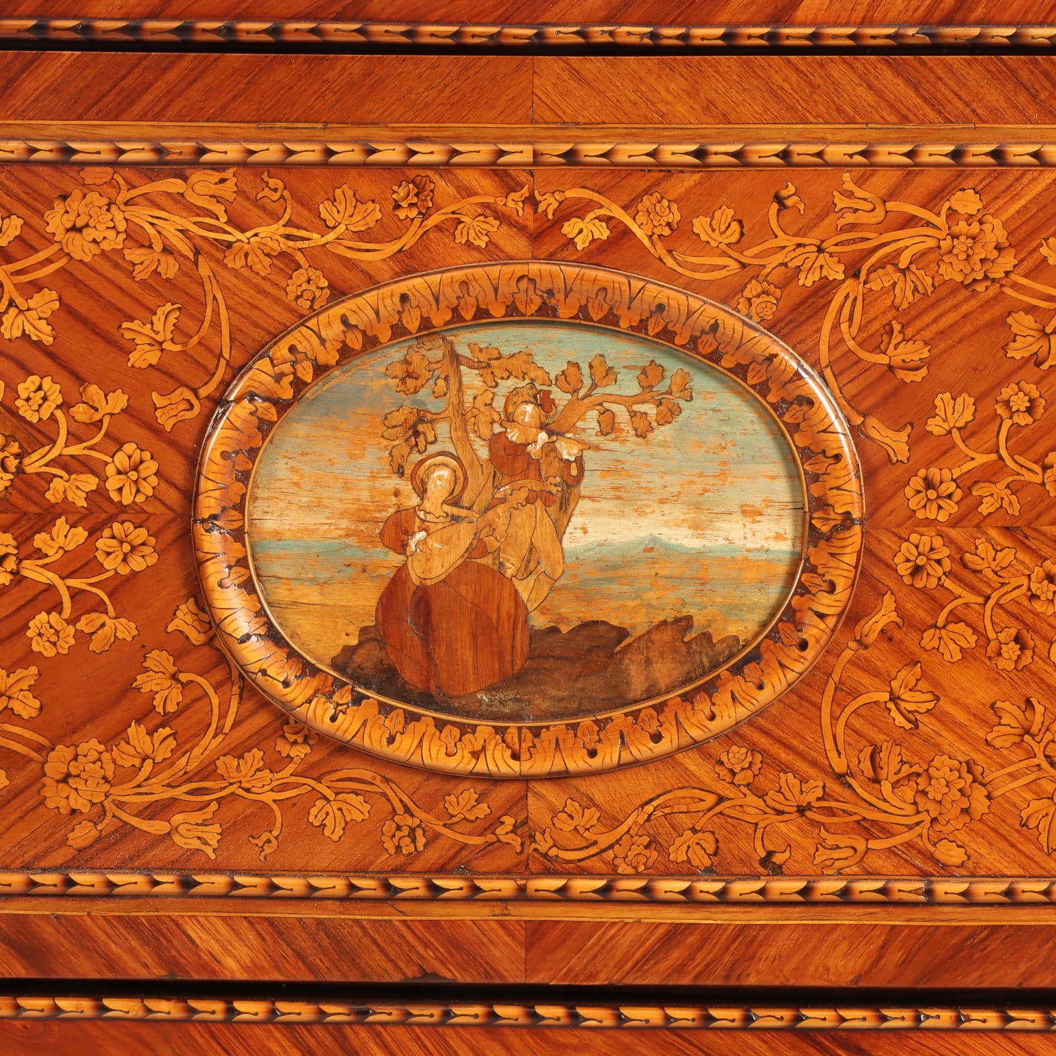 The central section presents shaped reserves with an oval medallion in the middle, which divides the drawer front into two panels; the background of the reserves is always inlaid with floral motifs, while the four roundels are inlaid with bucolic scenes using various woods — the sky and the figures’ flesh tones are painted. All the panels are framed by small raised mouldings, inlaid with a running arrow motif or, for the oval frames enclosing the roundels, with successive leaves. On the bois de violette ground, the inlay is executed in boxwood, with sand-shading used to create depth; only in the roundels is walnut burl used for the ground, with other woods forming the figures. The top is in antique green marble.
