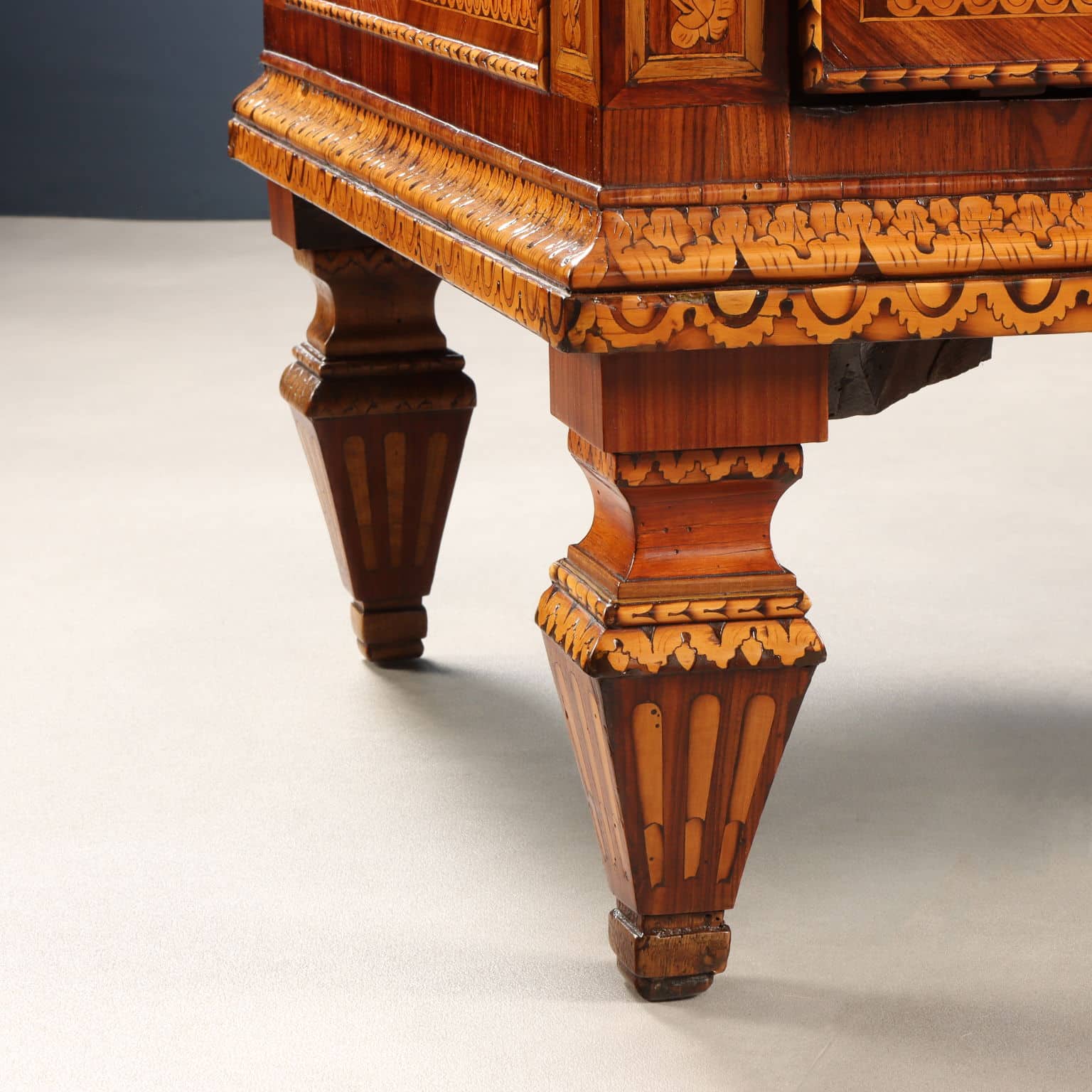 Three-drawer chest of drawers, made of walnut and pine wood, veneered in bois de violette with stringing and inlays in boxwood, olive, walnut burl, and other unidentified woods. Four truncated pyramid feet, inlaid with raised mouldings, support an inlaid frame on which the chest rests. The three drawers, with the central one being larger, divide the piece into three sections both on the front and on the sides; even the uprights are inlaid with candelabra motifs following the same arrangement. The entire piece is veneered in bois de violette, sometimes laid straight, sometimes at a 45° angle, creating a complex play of intersections. The upper and lower sections feature reserves with scrolling foliage inlays; in the upper section, two facing putti appear at the center.
