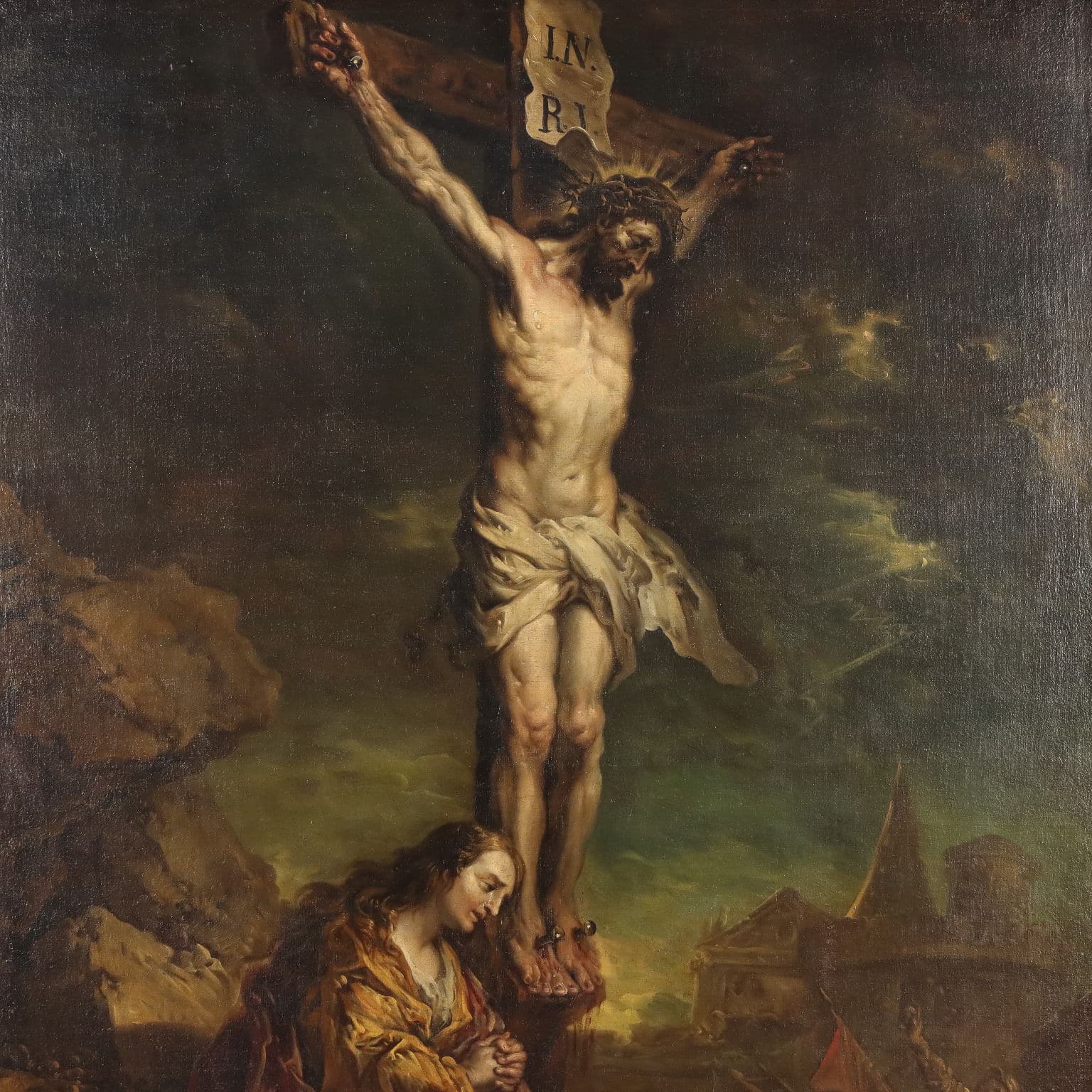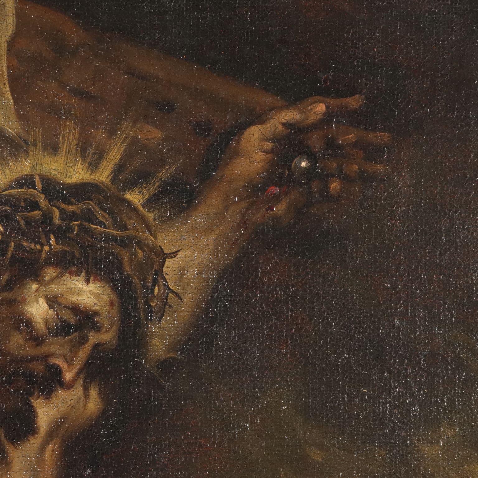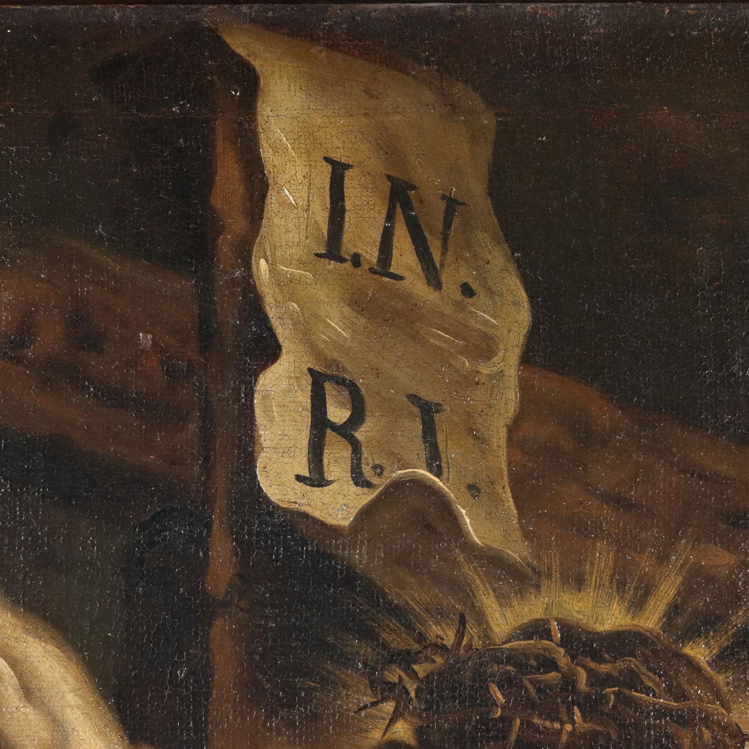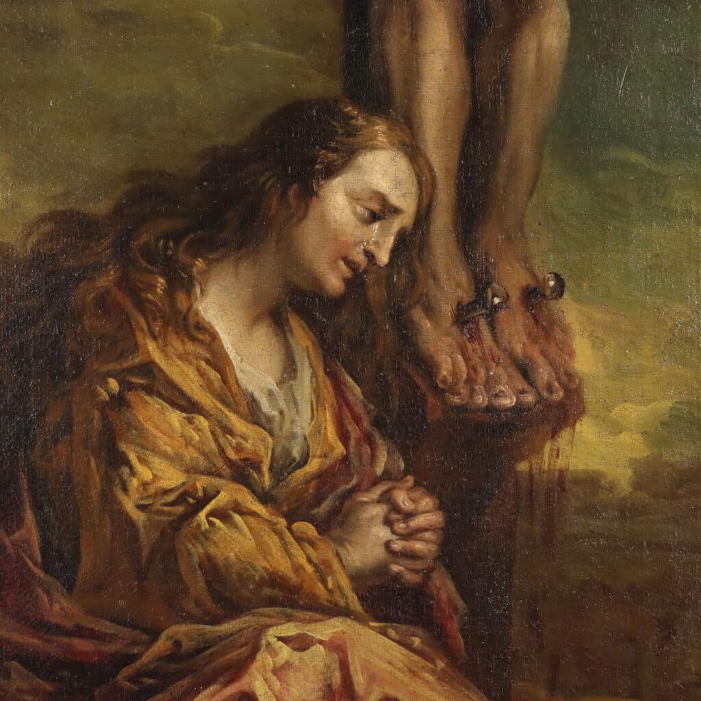 The painting depicts the dramatic scene of Christ crucified, accompanied by Mary Magdalene. At the center of the composition stands the figure of Christ on the cross, illuminated by an intense light that highlights His nude body, whose musculature is meticulously rendered, covered only by a white drapery. His head is bowed toward His chest and encircled by a crown of thorns, while above His head the inscription “I.N.R.I.” is visible.