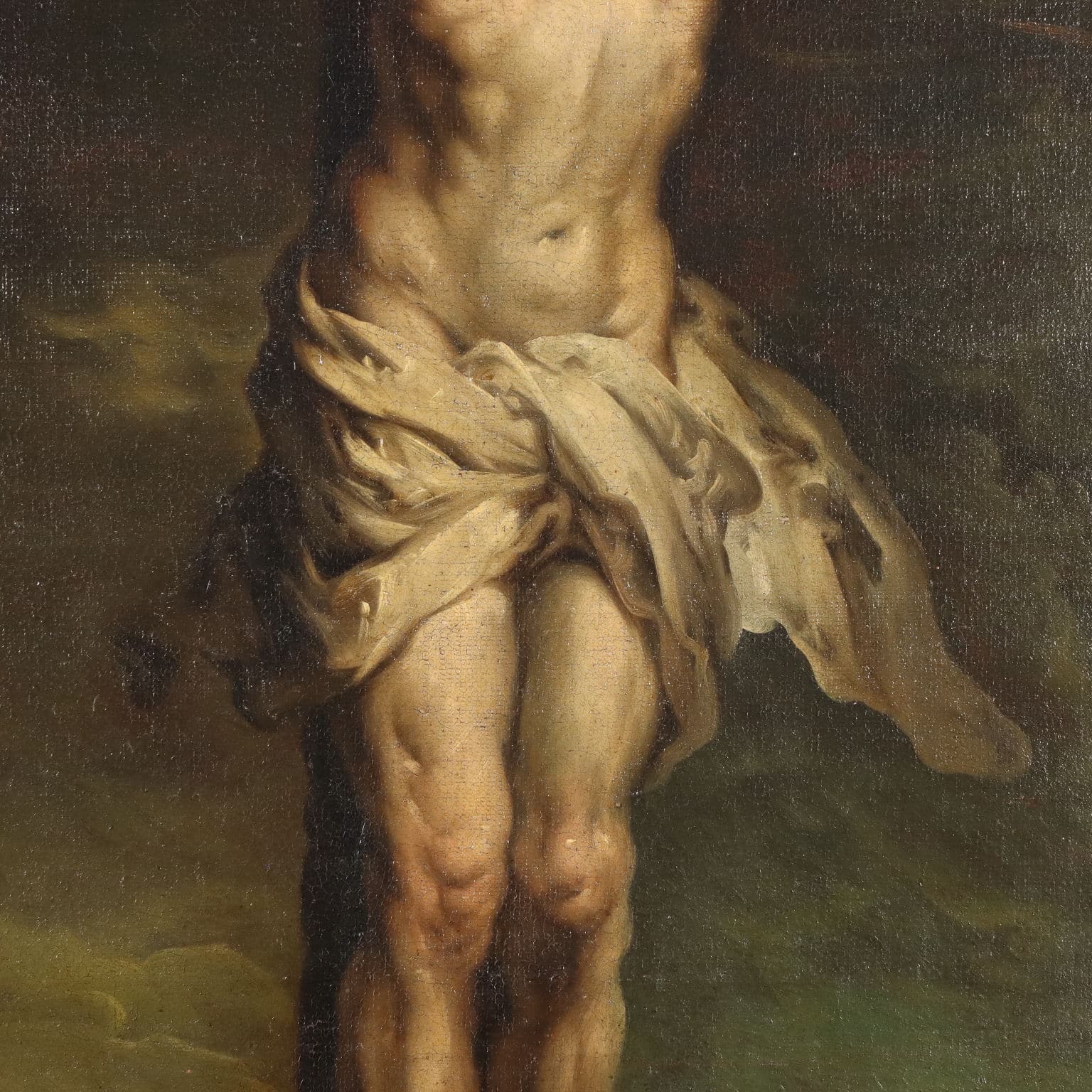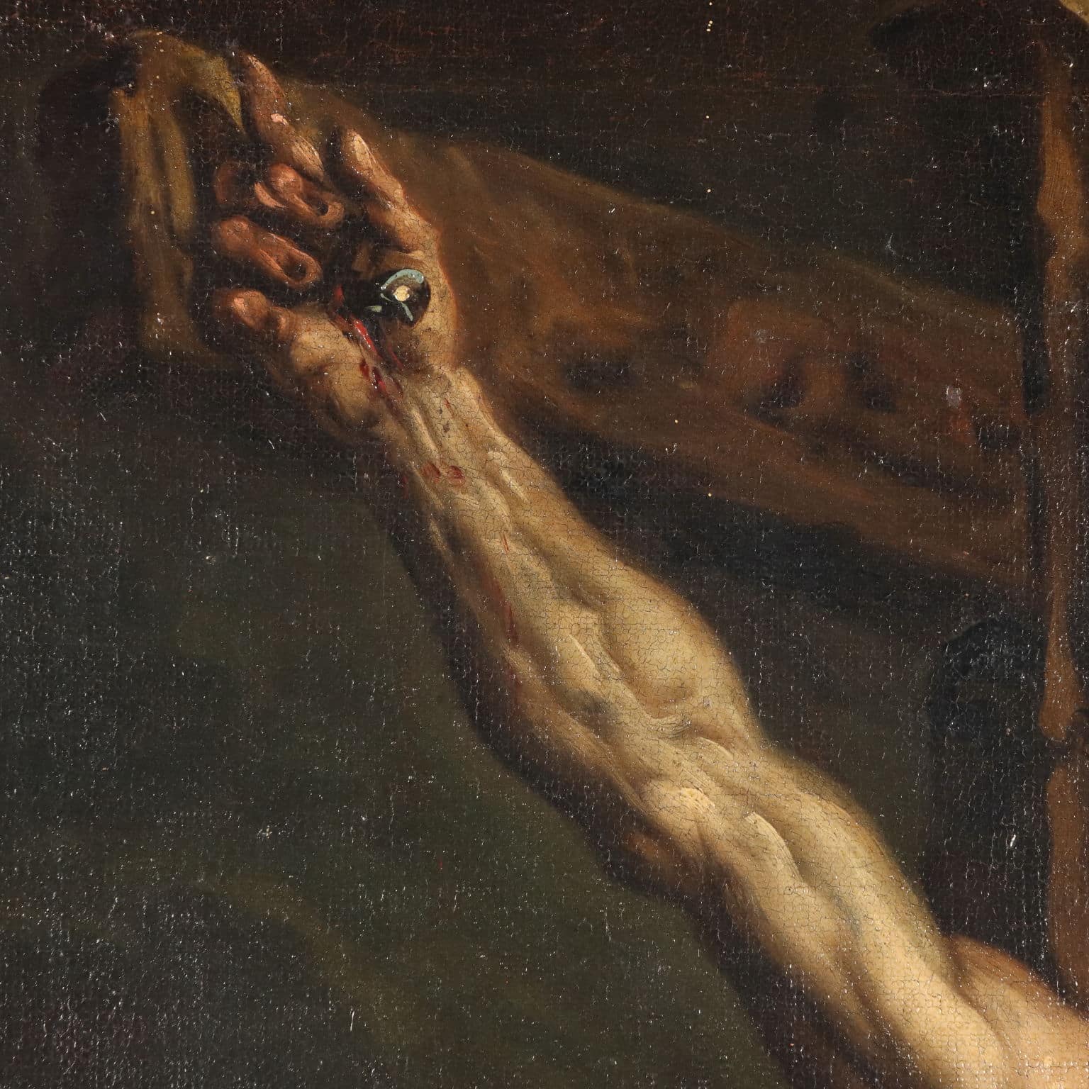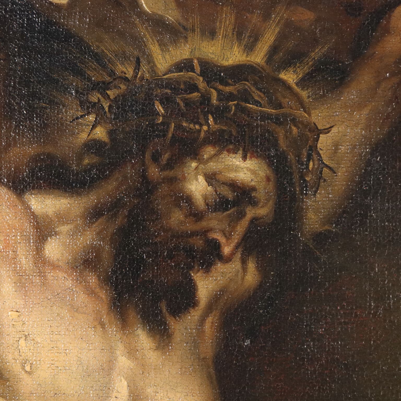The painting depicts the dramatic scene of Christ crucified, accompanied by Mary Magdalene. At the center of the composition stands the figure of Christ on the cross, illuminated by an intense light that highlights His nude body, whose musculature is meticulously rendered, covered only by a white drapery. His head is bowed toward His chest and encircled by a crown of thorns, while above His head the inscription “I.N.R.I.” is visible.