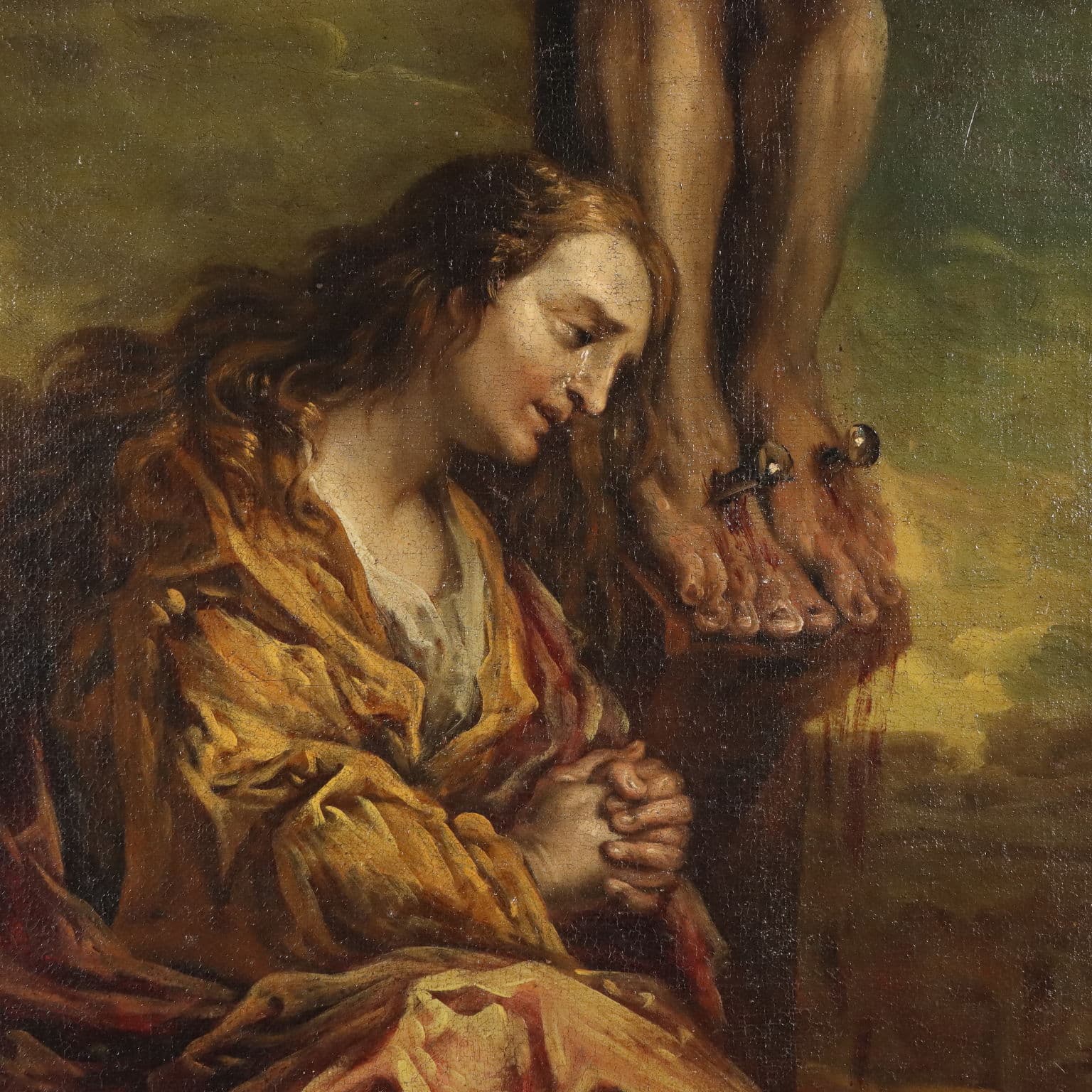At the foot of the cross, in the foreground, is the figure of Mary Magdalene kneeling, her hands clasped and her gaze absorbed, portrayed in a repentant attitude that conveys profound sorrow and devotion. The surrounding landscape is dark and troubled, with stormy clouds and a twilight glow that heighten the emotional tension of the scene. In the background, architectural structures and distant figures suggest the presence of witnesses and soldiers.