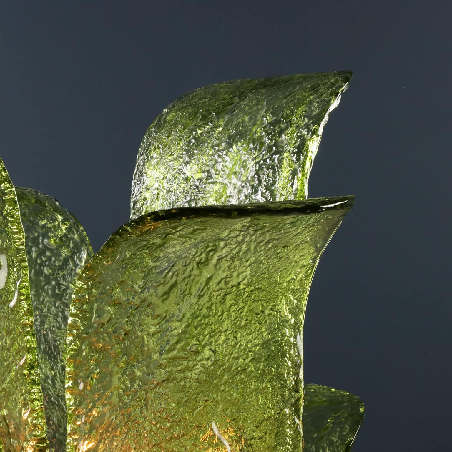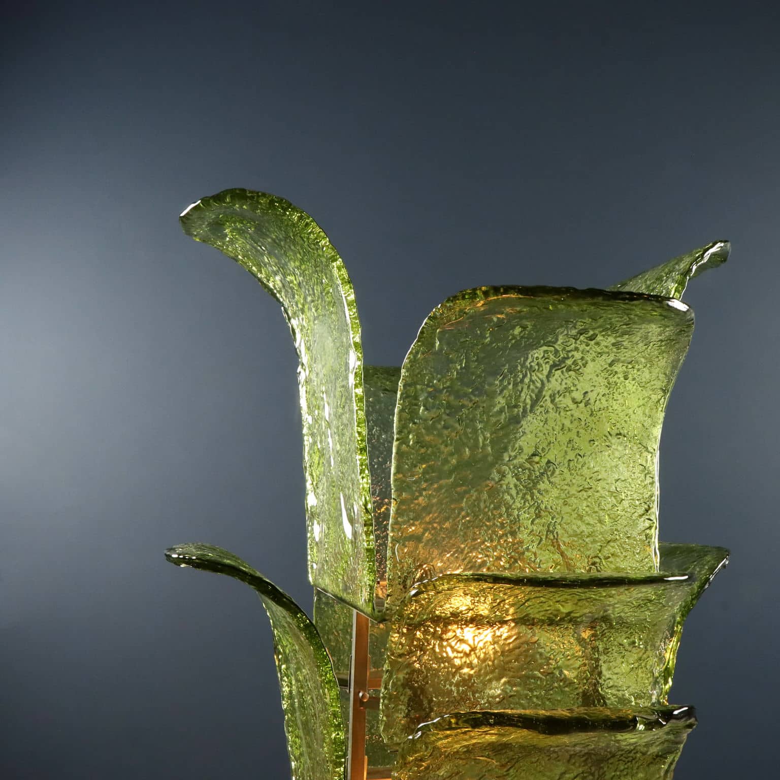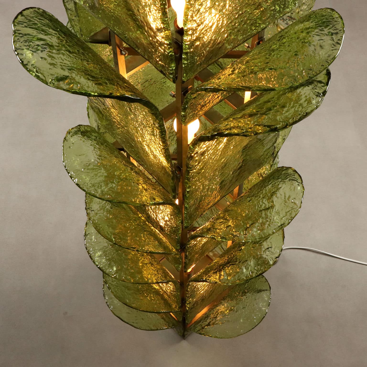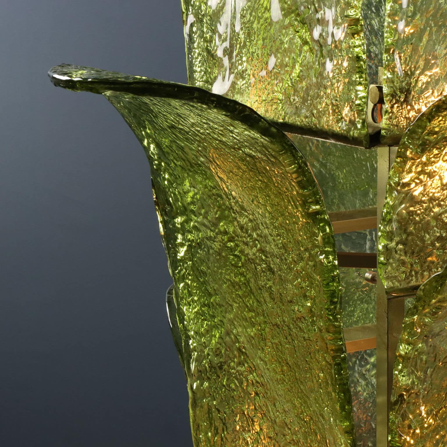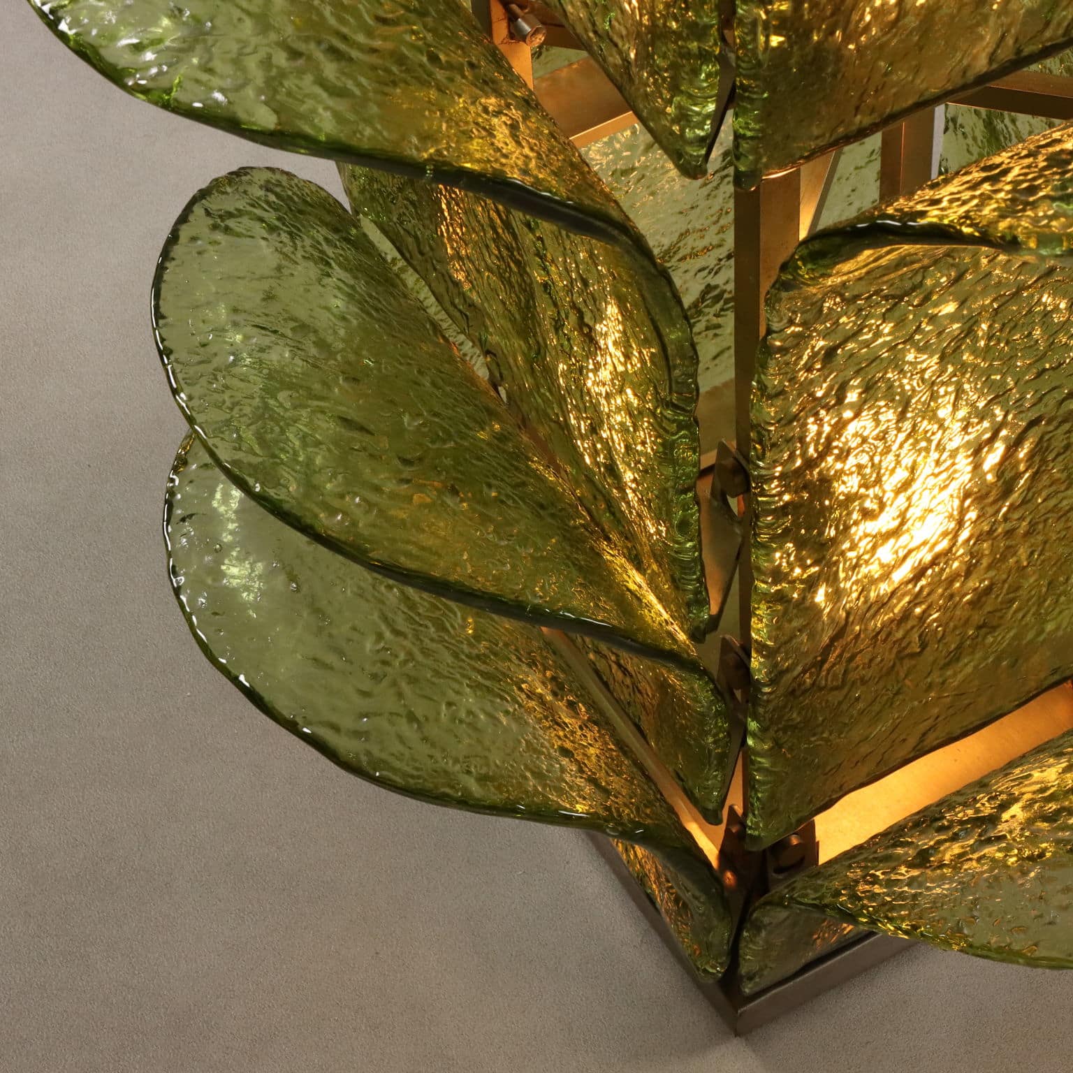 The lamp features a satin-finish metal frame, four light points, and curved Murano glass leaves in shades of green, varying in size and adjustable in position.