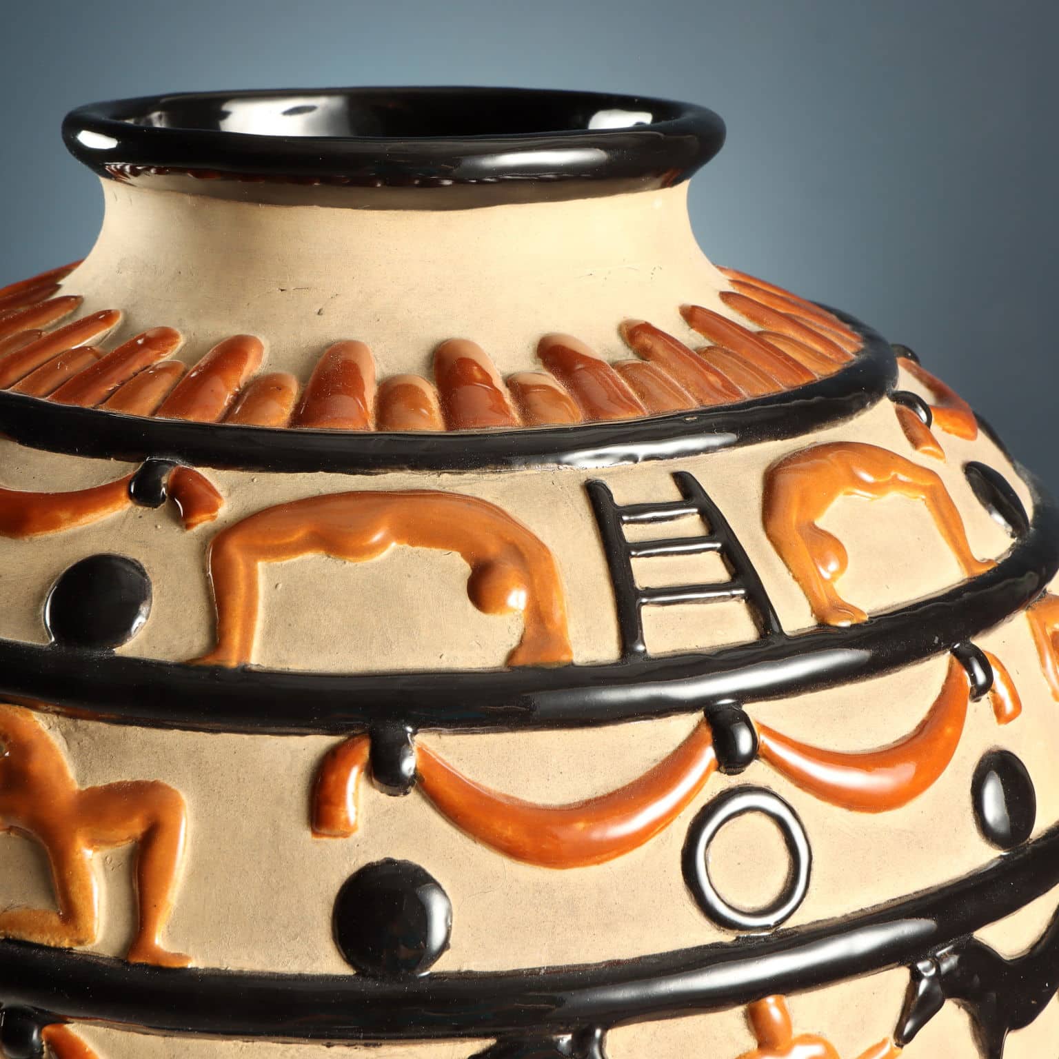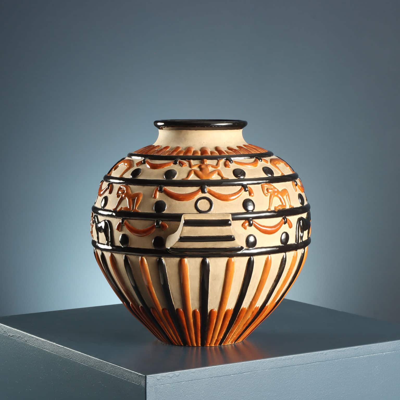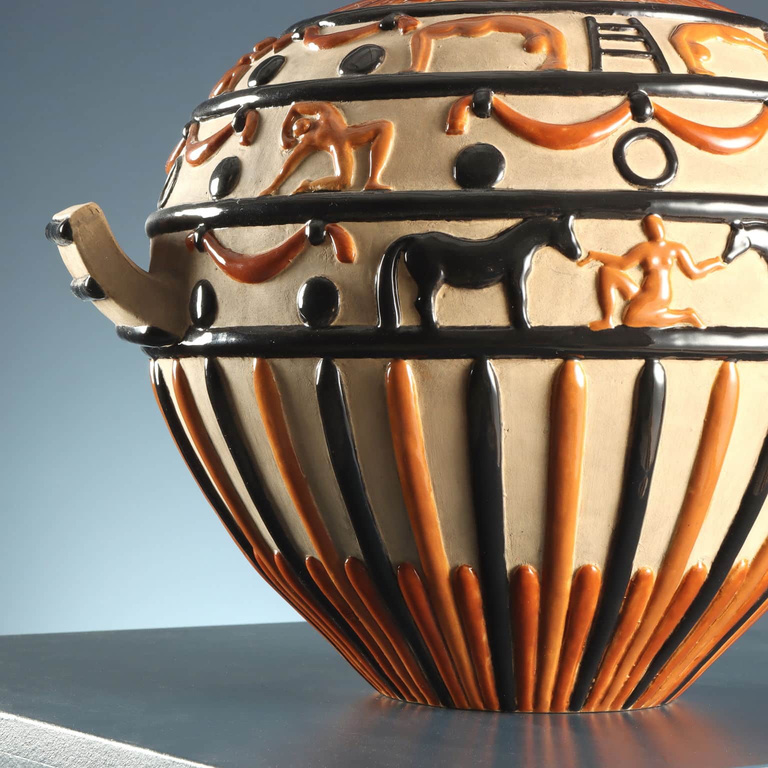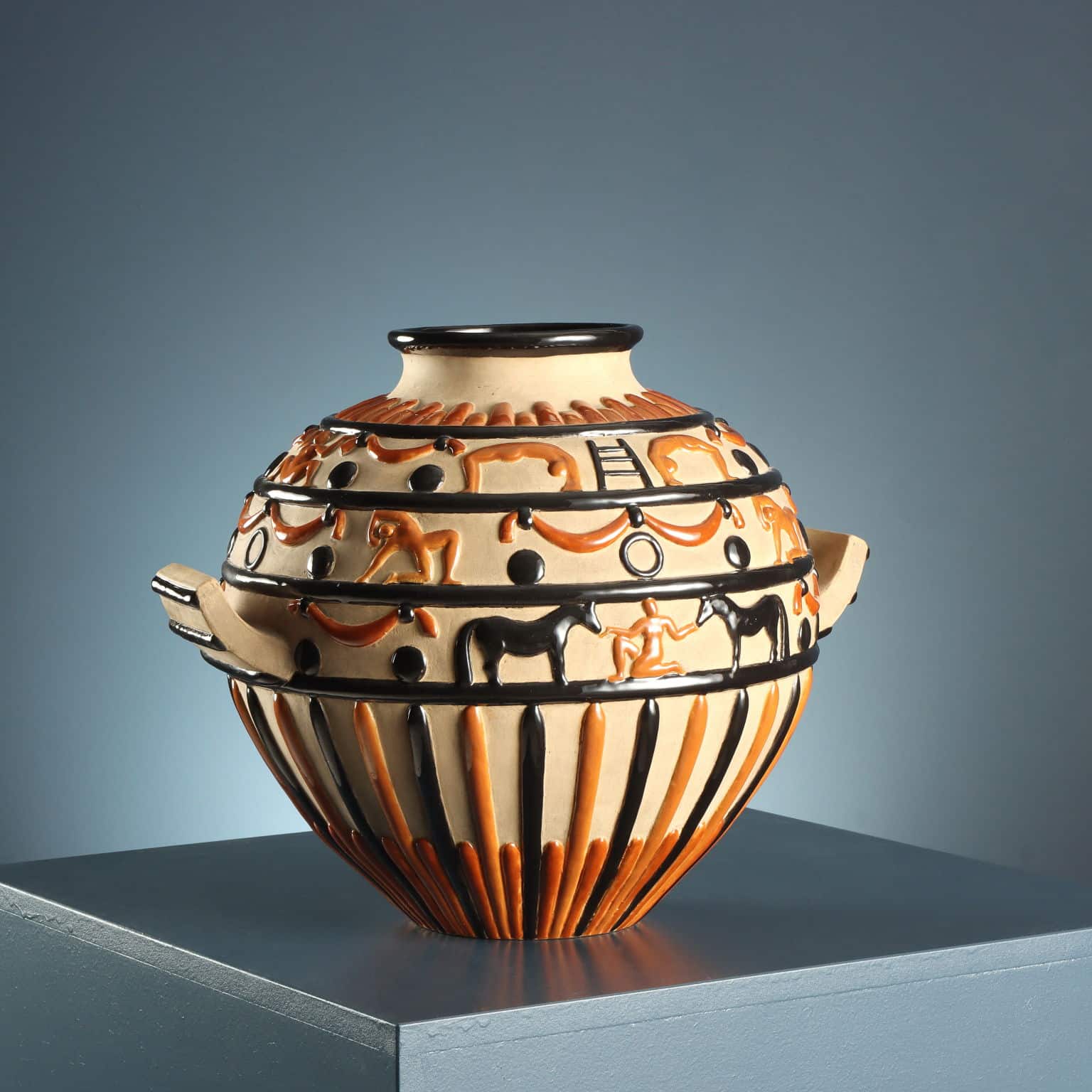 Ceramic vase with two side handles and circus-themed relief decorations. Finished on an unglazed background with a polychrome design highlighting the raised details in black and brown. The vase was designed in 1924; on the underside appears the Ginori mark of the period and the number 1023, indicating the model number.