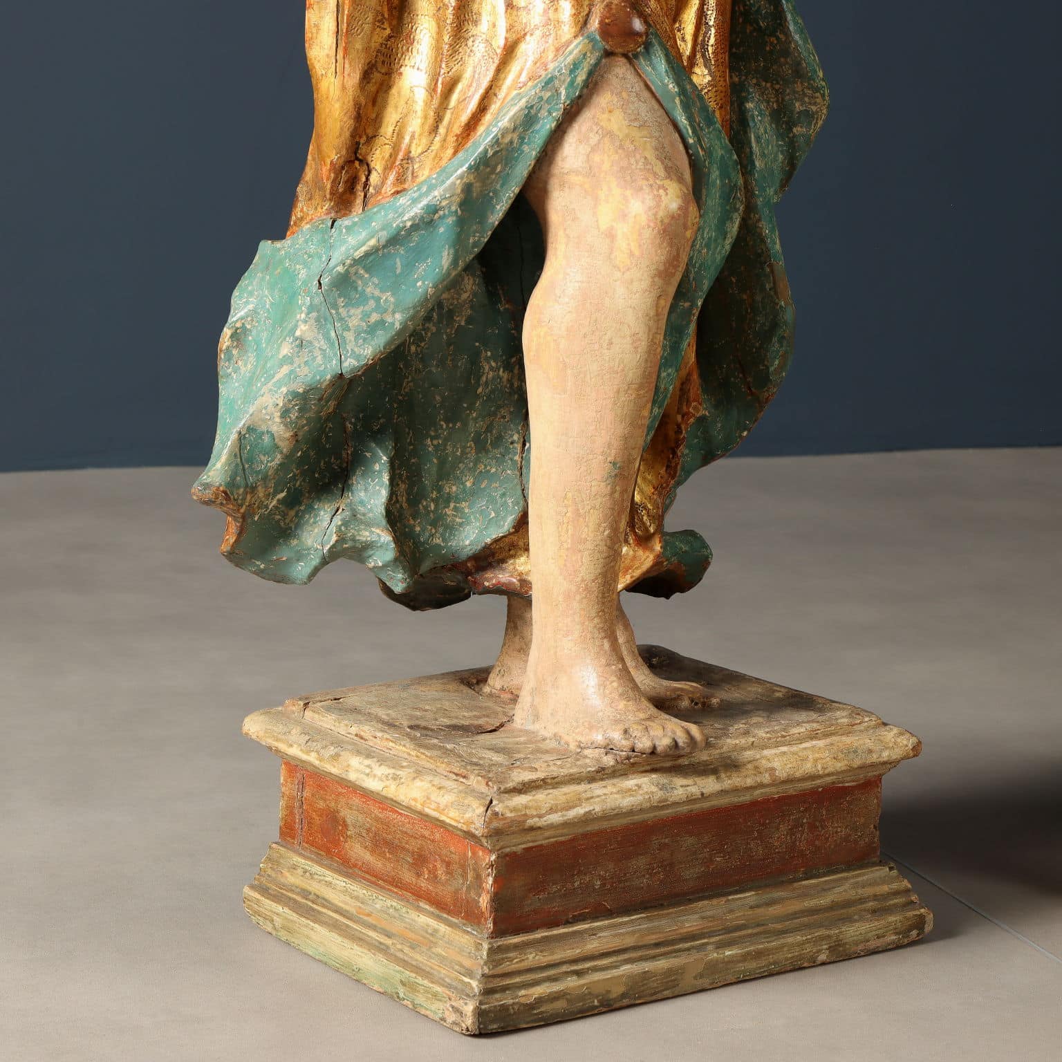 Sculpture depicting Saint Gerard standing, with a slight Anchement, on a hexagonal base; his head is slightly tilted downwards and he has long hair and a thick, slightly graying beard, indicating his advanced age. The saint is dressed in a long tunic tightened at the waist by a belt, while a long cloak rests on his shoulders; in his left hand he holds a wicker basket full of cherries. It presents shortcomings in the polychrome painting and in the ancient gilding; mutilated right hand.